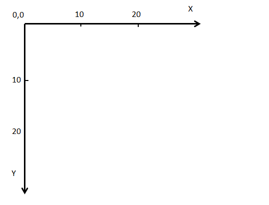 La mayoría de los motores 2D funcionan de esta manera. Comenzamos en la esquina superior izquierda que es la coordenada 0,0. Aumentamos el primer número de coordenadas que va a la derecha a medida que seguimos en el eje X. y aumentamos el segundo número de coordenadas que va hacia abajo en el eje Y. Puedes ver cómo se aplica esto en la imagen de arriba.