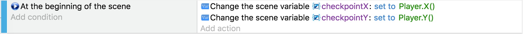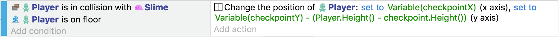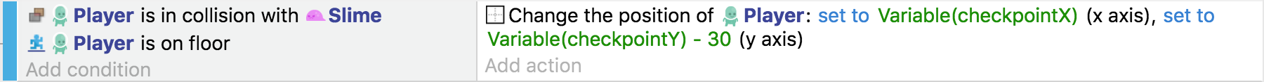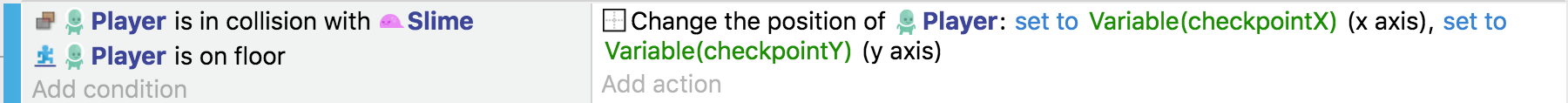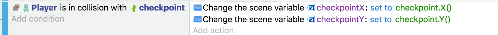 La condición ahora almacena la posición X e Y del objeto "punto de control" con el que nuestro objeto "Jugador" ha colisionado. Entonces, en lugar de eliminar el objeto sprite "Player", establecemos sus posiciones X e Y usando las variables.