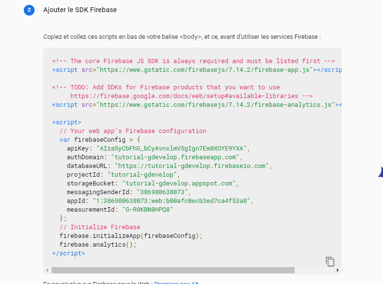 Les jeux GDevelop fonctionnent comme une *application web*, créés en donc une depuis Firebase  Mets un nom de ton choix et tu peux décocher la case "Firebase hosting". \<note\> A l'heure ou cet article est écrit il n'y a pas de possibilité d'utilisation de firebase hosting mais c'est possible que cela change Firebase devrait te montrer du code ressemblant celui-ci à present:  La seule partie nécessaire est *la configuration*, la partie entre les {}. Copie donc le contenu entre les {} **y compris les {}**. Chez moi ça serait: ```
