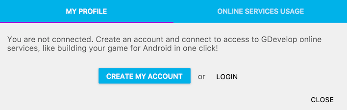 Un compte GDevelop est nécessaire pour quelques fonctionnalités, notamment l'exportation en un clic de votre jeu pour Android, iOS, Windows, macOS and Linux..