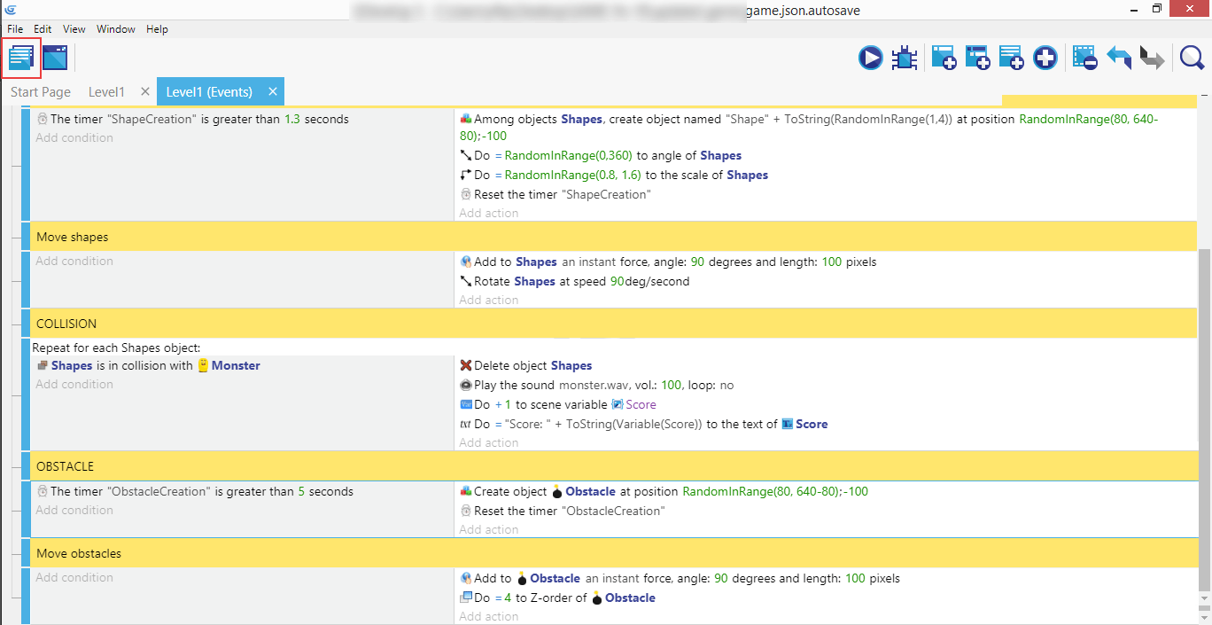 Cela nous permet d'avoir la condition spécifique Repeat for each Obstacle object (Répéter pour chaque objet Obstacle).