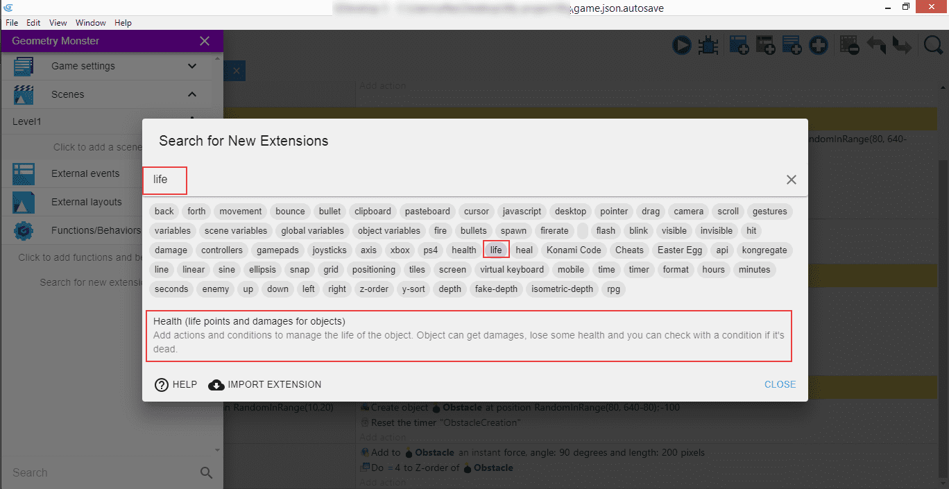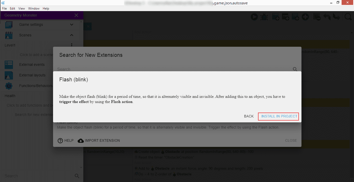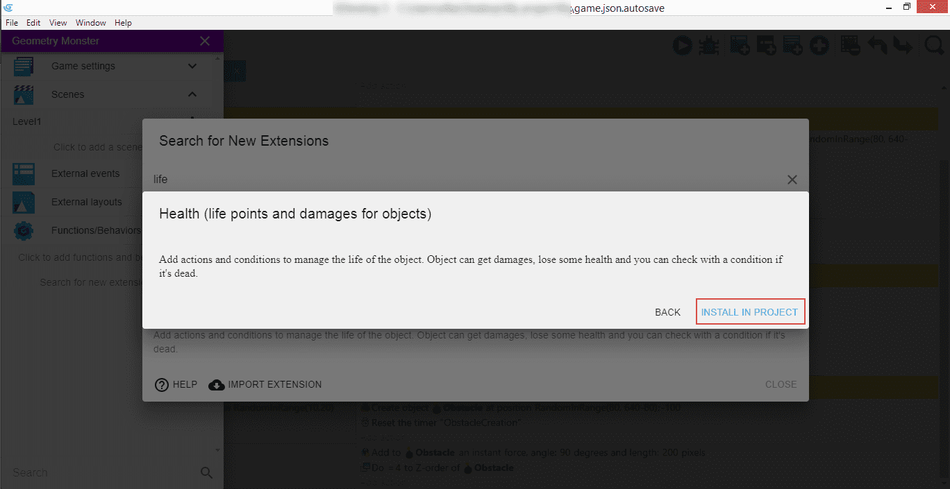 Cette extension contient un behavior (comportement) appelé Health (Santé), que nous pouvons ensuite manipuler dans le jeu pour gérer la vie d'un objet. Cliquez sur INSTALL IN PROJECT (Installer dans le projet) pour pouvoir l'utiliser.