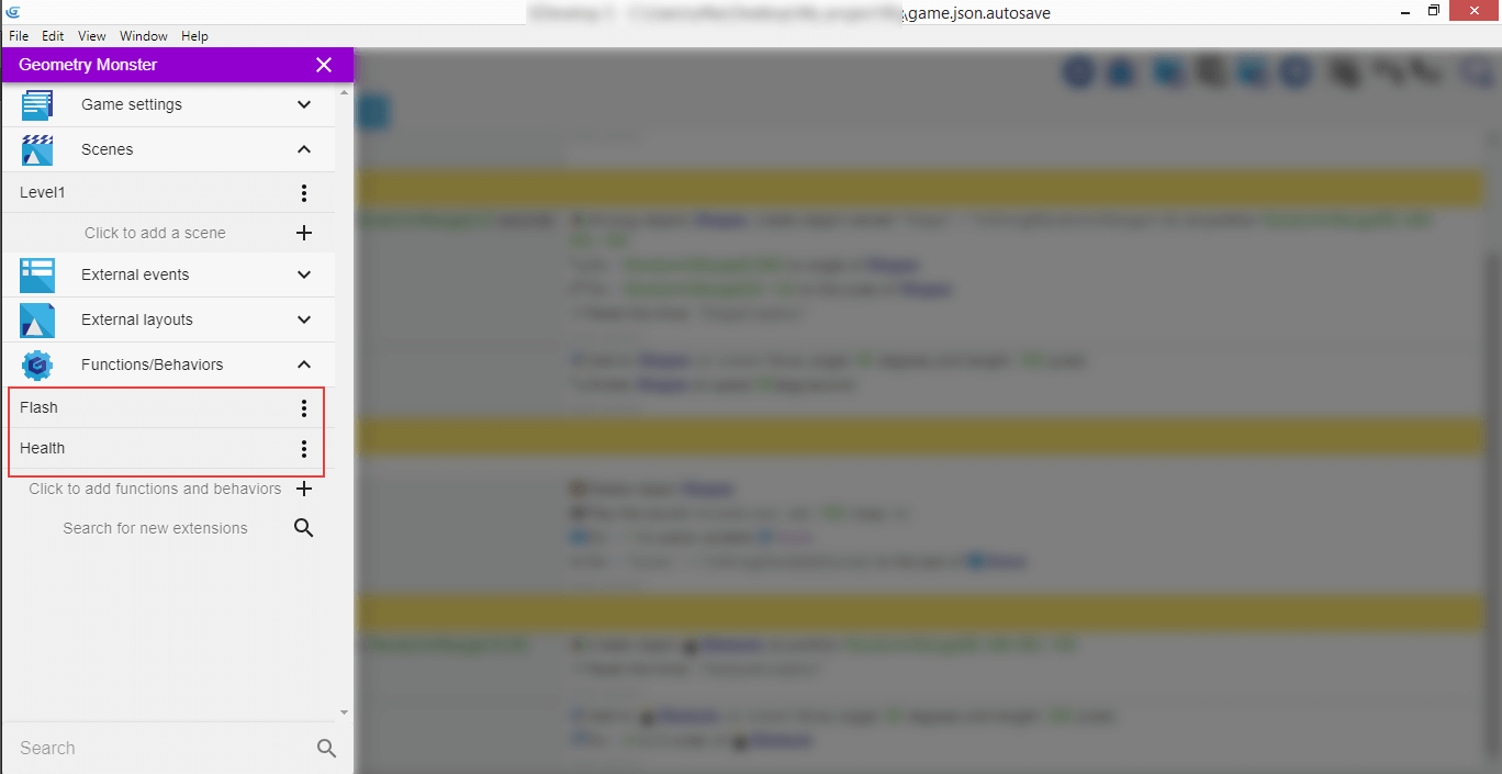 Maintenant que nous avons installé les deux extensions, elles doivent être répertoriées dans le panneau de gauche, sous Functions/Behaviors (Fonctions/Comportements).