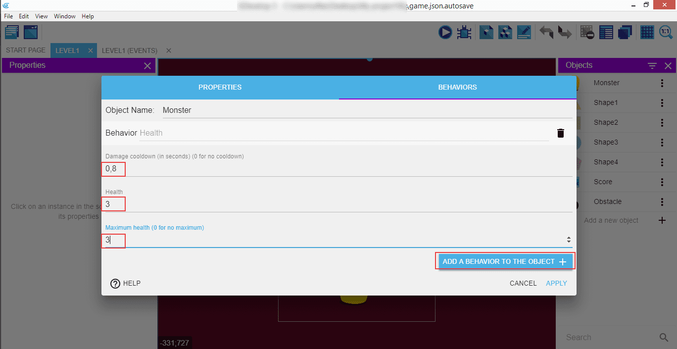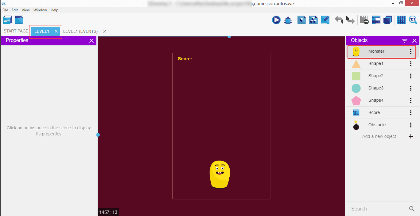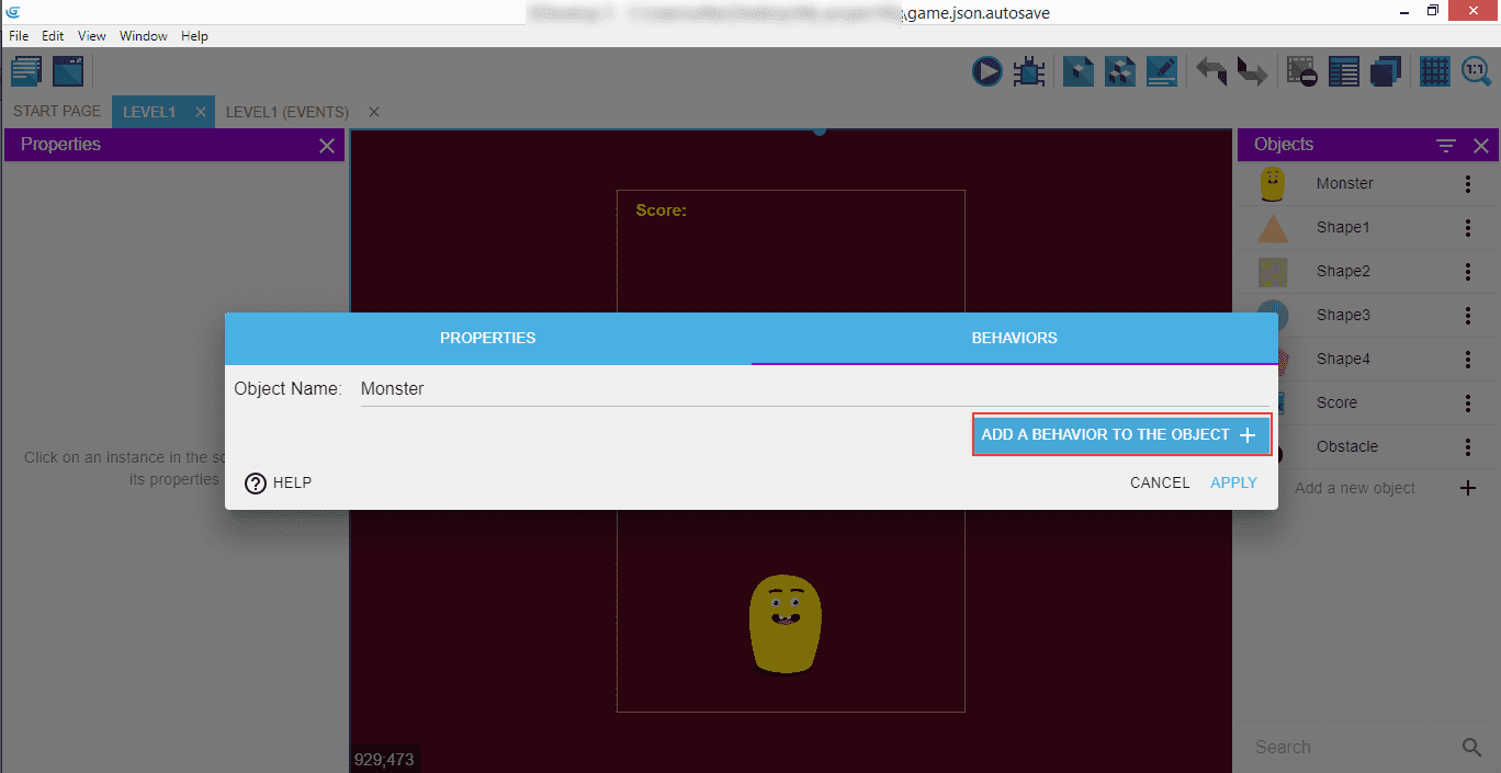 Cliquez sur l'onglet LEVEL1 pour revenir dans l'éditeur de scène puis, dans le panneau de droite Objects, double-cliquez sur Monster, ce qui ouvre une fenêtre contextuelle.