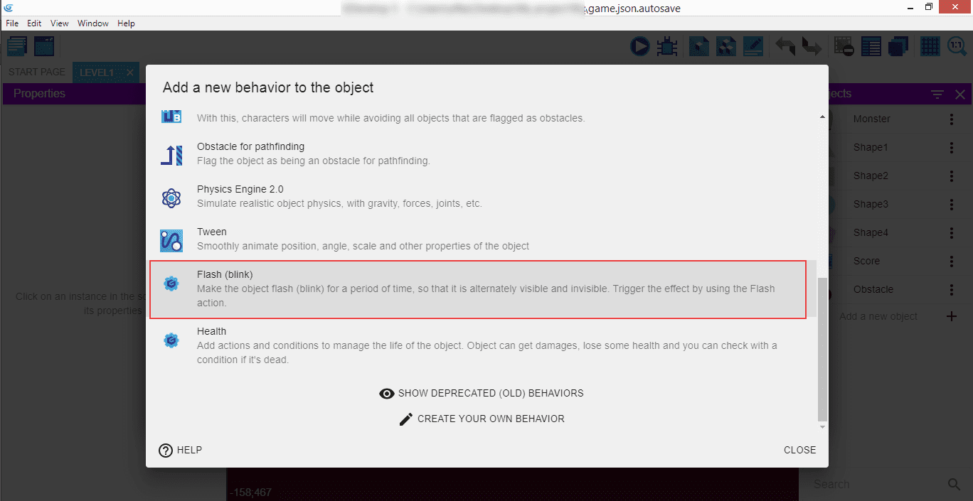Les deux extensions personnalisées que nous venons d'ajouter doivent être répertoriées dans la fenêtre Ad a new behavior to the object et disponibles pour utilisation. Cliquez sur l'extension Health.