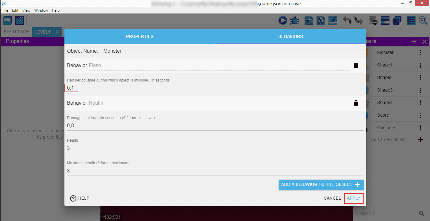 Le paramètre Half period (demi-période) spécifie la durée pendant laquelle l'objet est invisible, et nous allons la fixer à 0,1 secondes. Dans le champ juste en dessous, vous pouvez voir le comportement Health que nous avons entré précédemment. Cliquez sur APPLY pour les enregistrer.