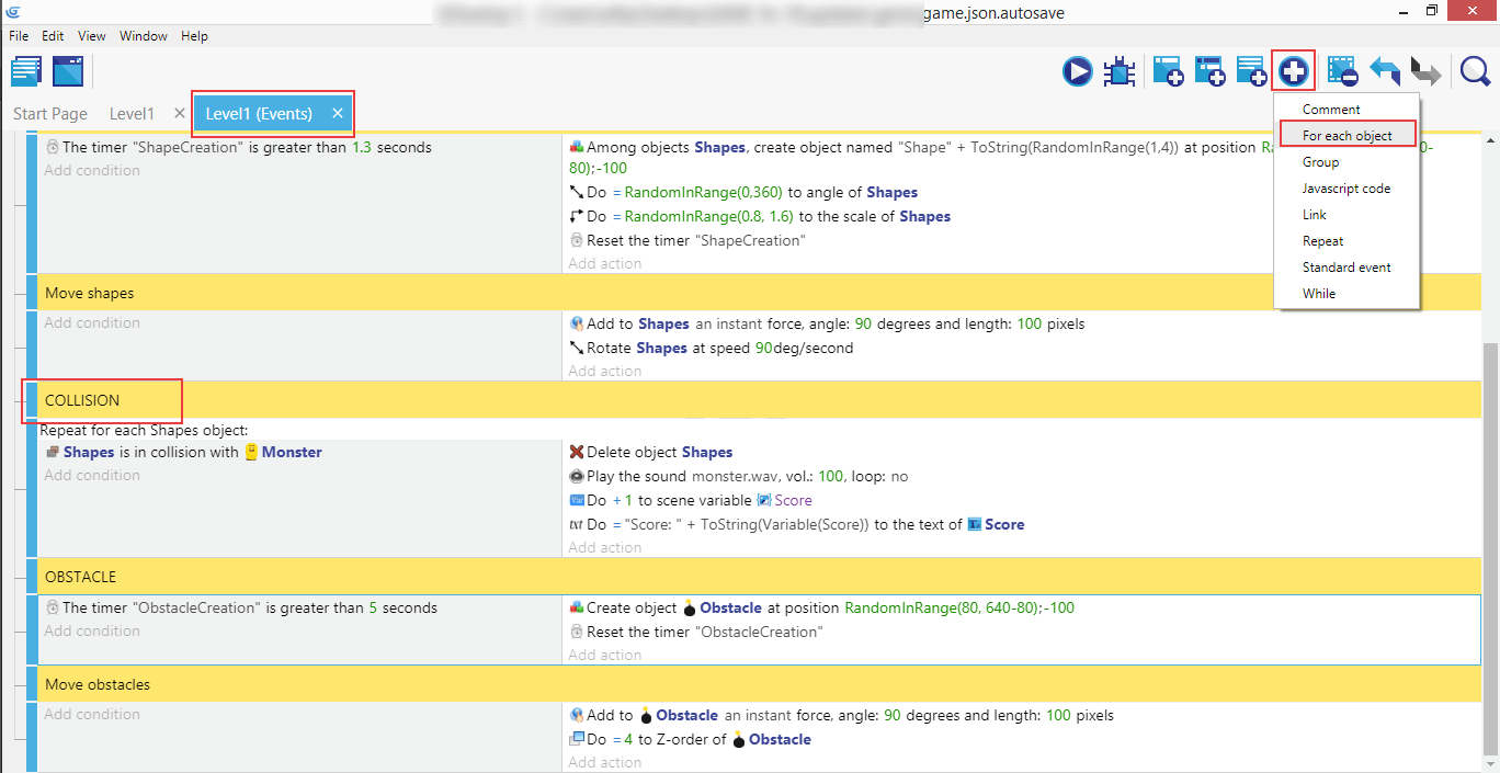 Cliquez maintenant sur l'onglet Level1 (Events), puis sur le label Collision (un commentaire) pour vous assurer que c'est bien celui qui est actif. Dans le menu en haut à droite, cliquez sur l'icône Choose and add an event (Choisir et ajouter un événement), puis sur For each object (Pour chaque objet) dans la liste déroulante qui s'est ouverte.