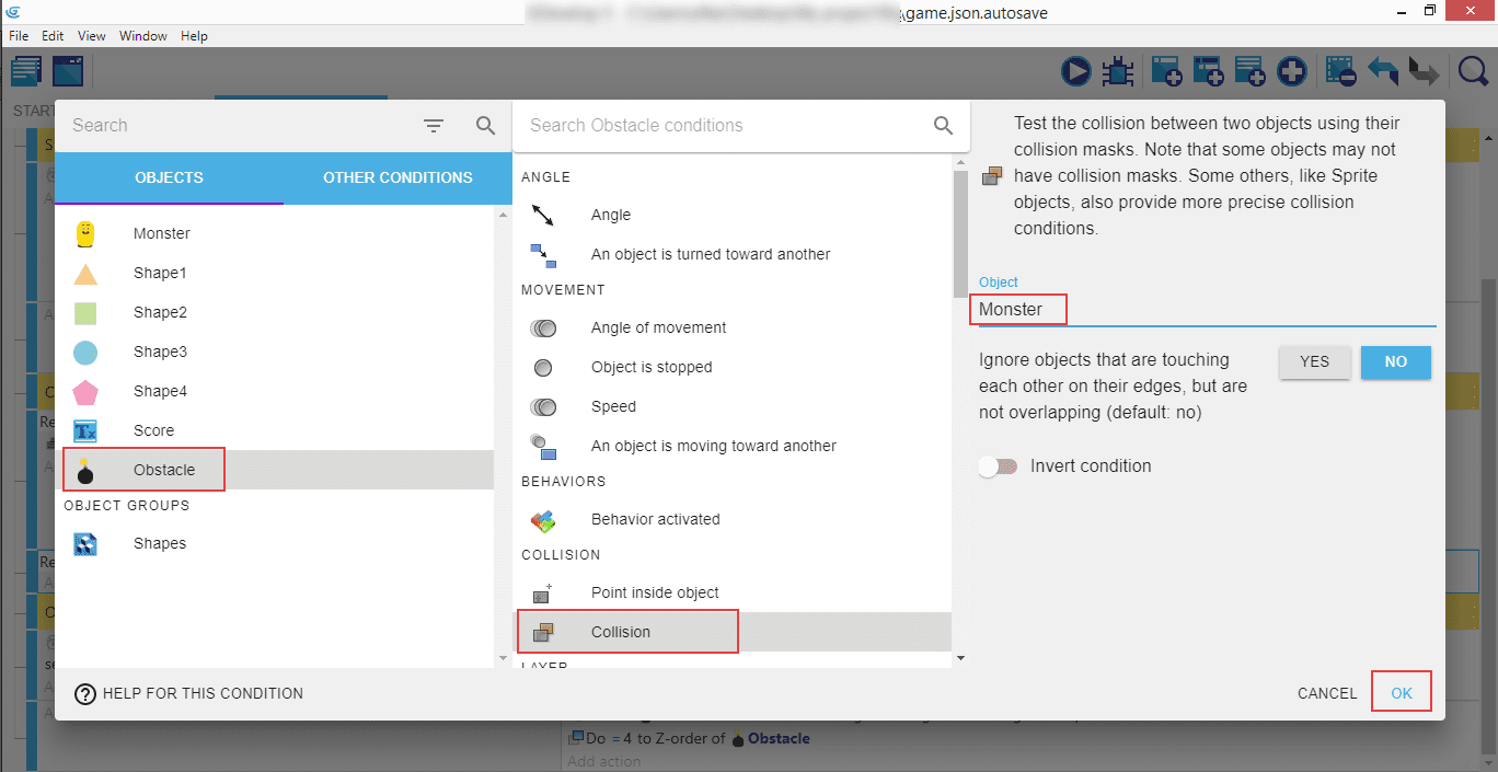 Cliquez sur Add condition. Sélectionnez Obstacle, Collision et Monster puis cliquez OK. De cette façon, les bombes entreront en collision avec le monstre, et nous pourrons soustraire le nombre actuel de vies lorsque cela se produira.