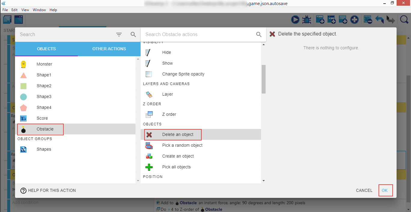 Toujours pour Obstacle, sélectionnez l'action Delete an object (Supprimer un objet) pour supprimer la bombe. Chaque fois qu'une bombe frappe le monstre, elle est supprimée du jeu.