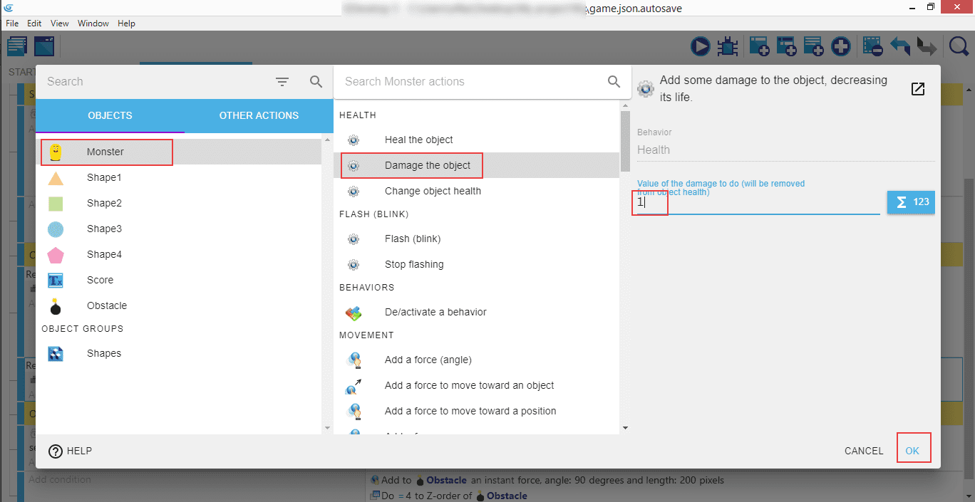 Une autre action va être utilisée pour que le monstre soit endommagé par la bombe. Cliquez sur Add action. Sélectionnez Monster, Damage the object (Endommager l'objet), en entrez 1 dans le champ Value of the damage to do (Valeur du dommage). Cela signifie que chaque fois que la bombe frappe le monstre, il perd une vie.