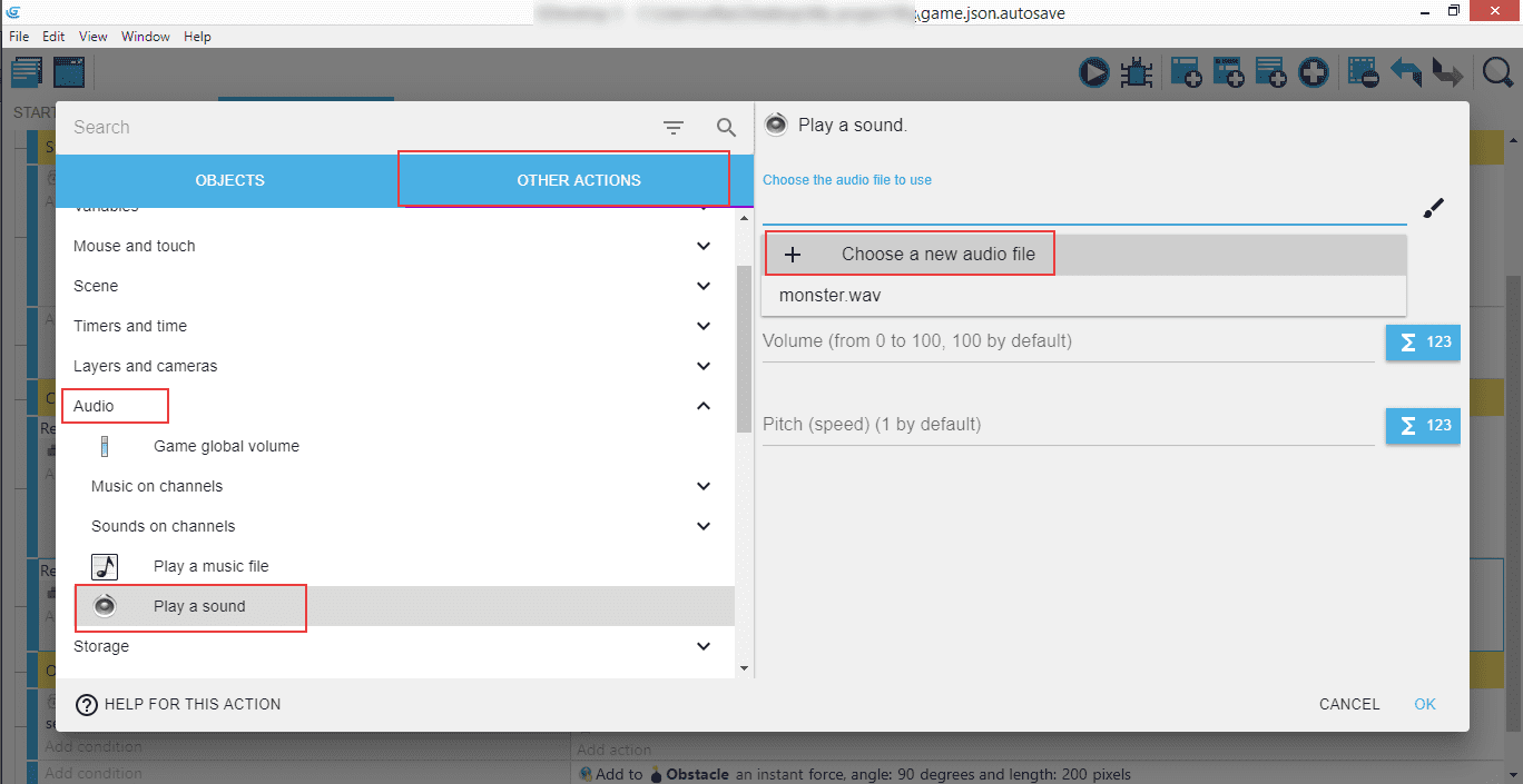 Dans l'onglet OTHER ACTIONS, ajoutons un son différent lorsque cela se produit. Sélectionnez Audio, Play a sound (Jouer un son), et Choose a new audio file (Choisir un nouveau fichier audio) pour ouvrir la fenêtre de l'explorateur de fichiers.