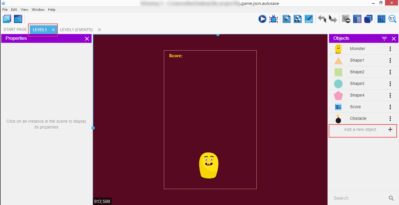 Cliquez sur l'onglet LEVEL1, puis dans la liste Objects sur Add a new object (Ajouter un nouvel objet).