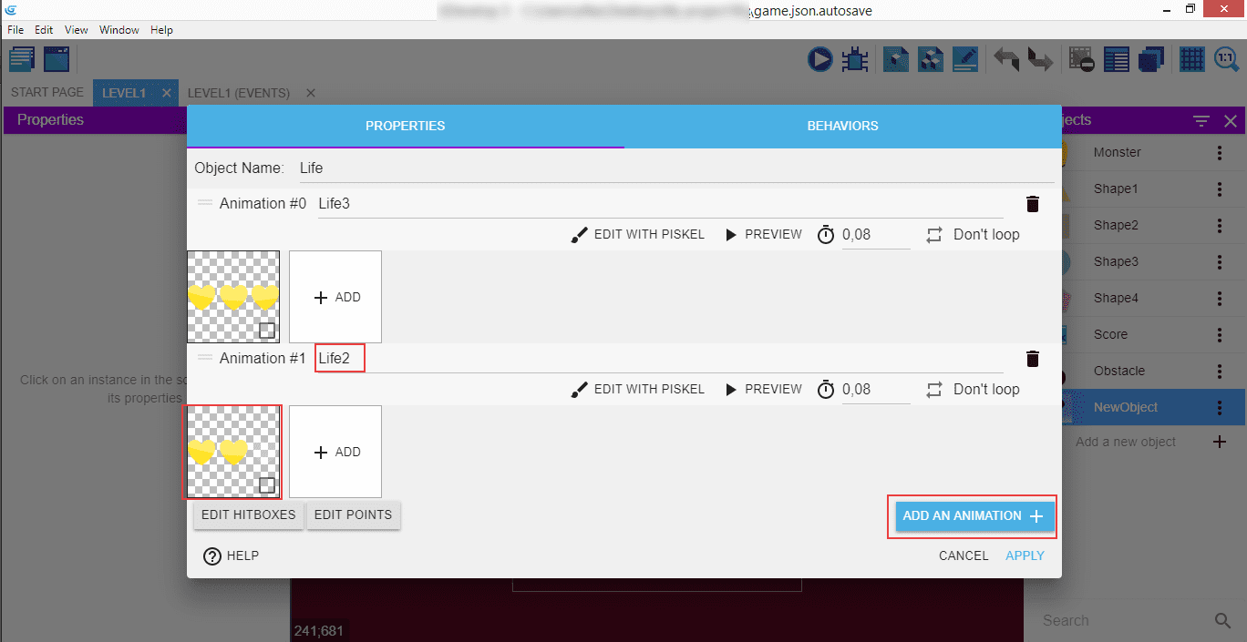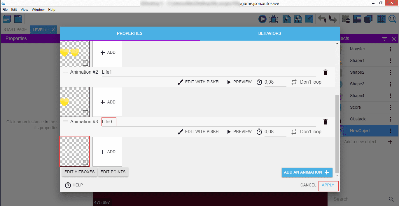 Le nom de l'objet Object Name: est Life, l'animation Animation #0 s'appelle Life3 (puisque l'état initial de l'animation a trois vies), puis ajoutez l'image avec 3 cœurs.