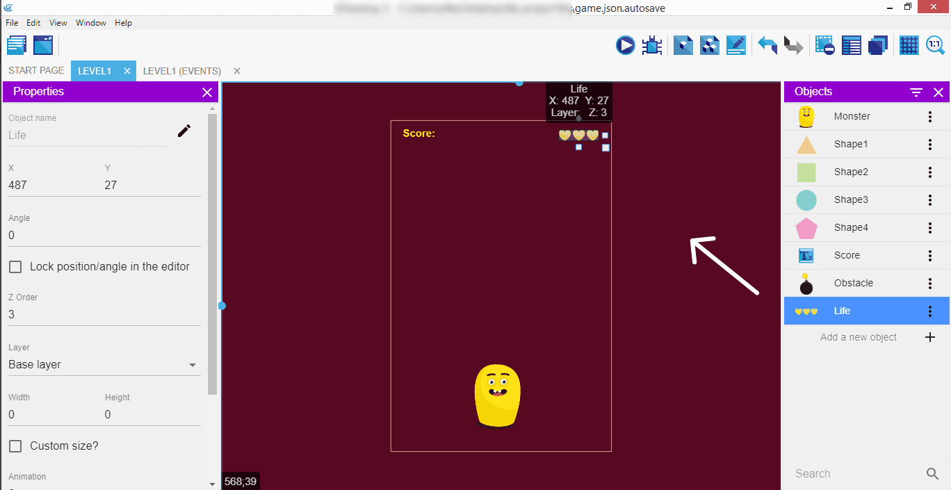 Faites glisser et déposez l'objet Life sur la scène et placez-le dans le coin supérieur droit. Nous verrons au chapitre suivant comment animer cet objet en créant un écran game over lorsqu'il atteindra zéro.