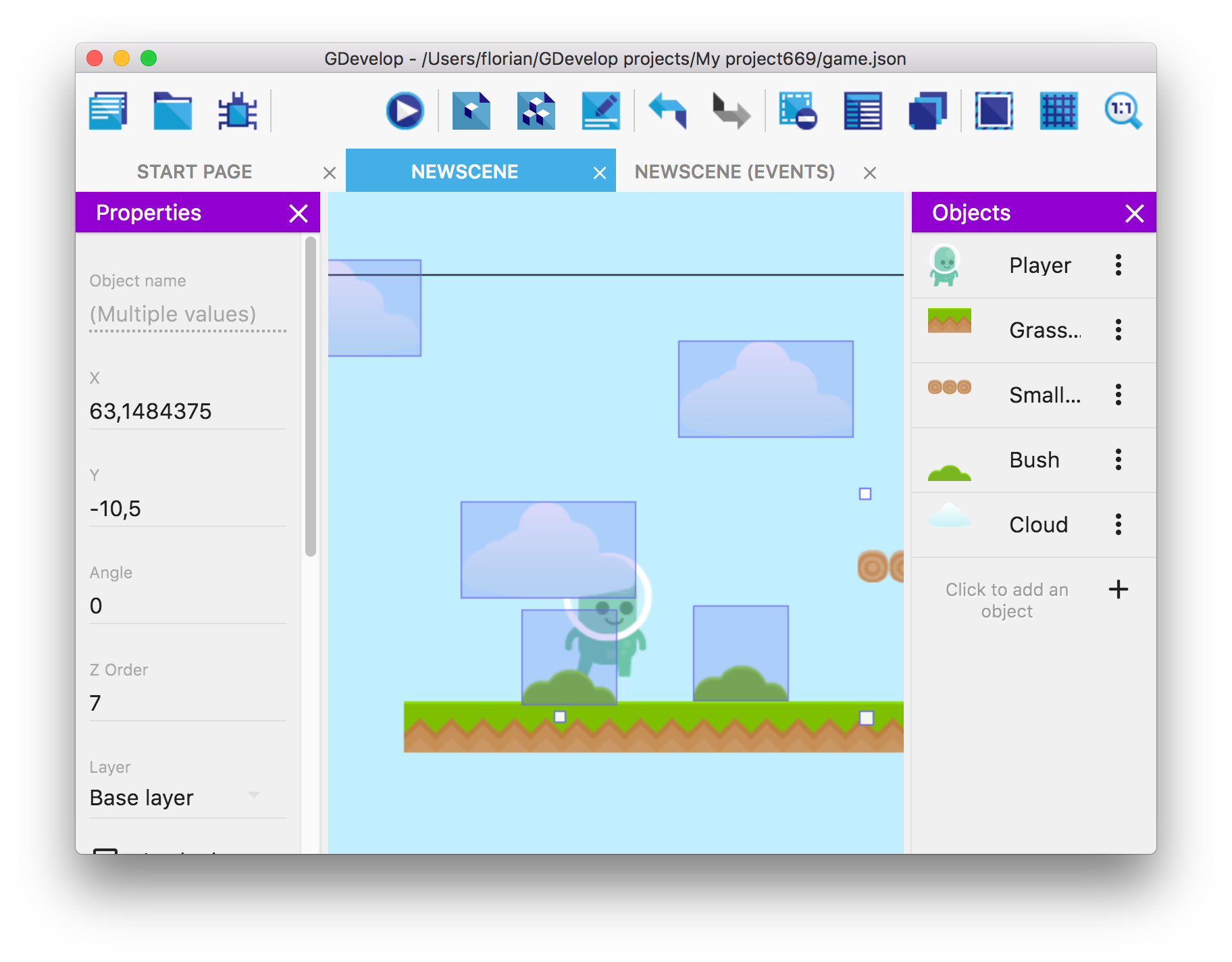 Vous pouvez maintenant changer le z order des buissons et des nuages en leur donnant des valeurs négatives de manière à ce que le personnage du joueur (dont le z vaut 1 puisque c'est le premier objet placé sur la scène) soit toujours affiché devant les autres objets.