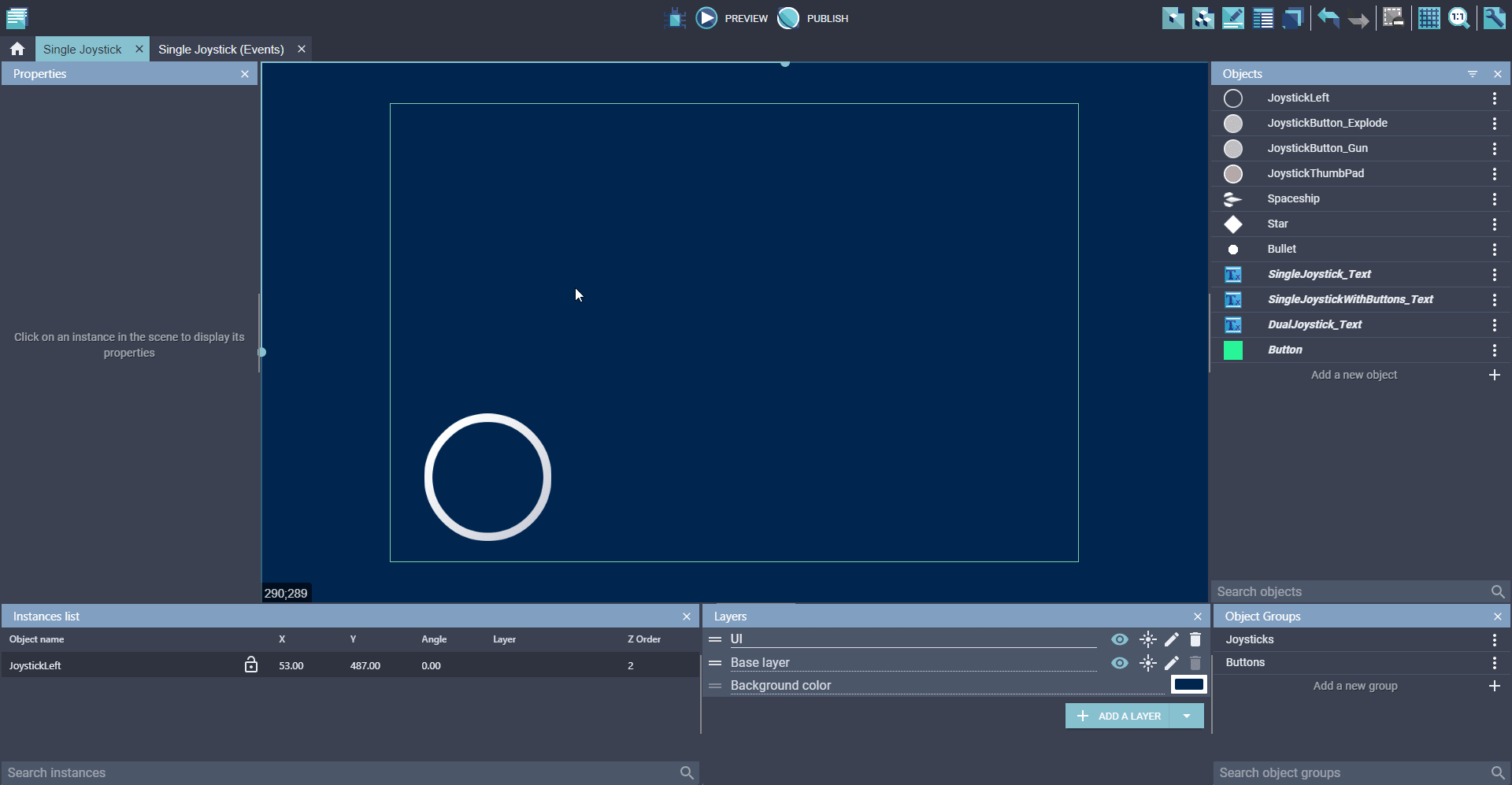 • Double-click on your "Joystick" object - Click on "Behaviors" tab - Click "Add a behavior" - Search for "joystick" and select "Multitouch Joystick" - Select "Floating" if you want the player to be able to move the joystick position - Click "Apply"