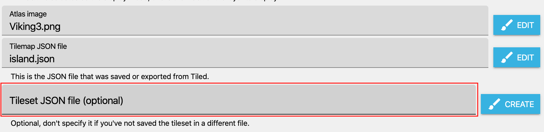 Finally, choose the tileset file in GDevelop, in addition to choosing the atlas image and the tilemap JSON file: