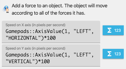 この機能はゲームパッド拡張機能をプロジェクトに追加すると有効になります。その後、条件か式の中でゲームパッドが接続されているかどうかやボタンを押したか、ボタンを放したか、スティックを押したかなどをテストできます。